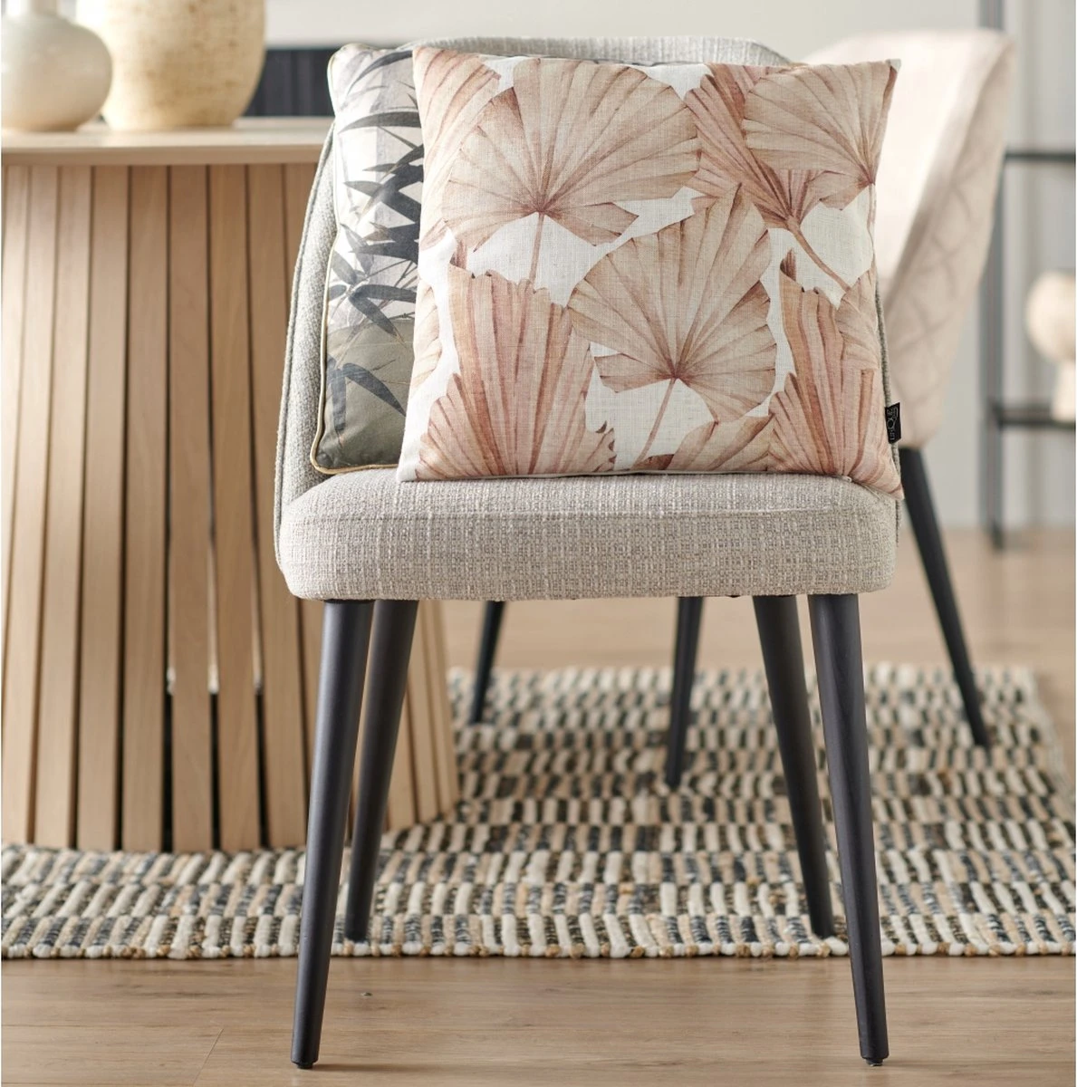 Sierkussen Bladeren is 45×45 cm en heeft een neutrale basiskleur en een linnen structuur met een print van bladeren. Het kussen is gemaakt van 90% polyester en 10% linnen. Bladeren heeft een vlakke achterkant met rits, zo kun je gemakkelijk het binnenkussen eruit halen..